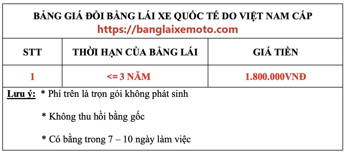 3. Bảng giá dịch vụ đổi bằng lái xe quốc tế IDP do Việt Nam cấp: